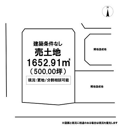 | 土地面積/坪(坪単価) | 1,652.91m2(登記簿)/500.88坪(9.00万円) | 代表的な接道 | 四方 公道 北 6m、南 6m ※詳細は備考欄をご確認ください |