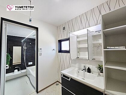三面鏡にハンドシャワー付で使いやすい洗面台です。洗面脱衣室もゆったりの広さ。人気の三面鏡ドレッサーは、身支度に便利なだけでなく収納にも優れています。シャワーヘッドつきなので朝シャンも出来ますね。