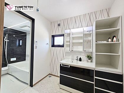 タオルや下着類などをすっきりと収納しておくことのできる便利な空間です。お出かけの前に身だしなみを整えるために毎朝使う設備だからこそ便利で良いものが良いです。小窓がついて明るい洗面所です。