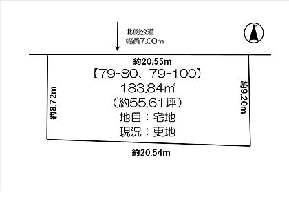 | 土地面積/坪(坪単価) | 183.84m2(登記簿)/55.71坪(6.30万円) | 代表的な接道 | 公道 北 7m ※詳細は備考欄をご確認ください |