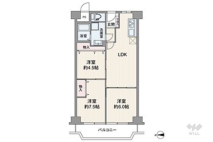 •  間取りは専有面積60.5平米の3LDK。複数方向に採光部があり、バルコニー面積は7.71平米です。