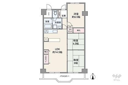 間取りは専有面積70.75平米の3LDK。LDK約14.5帖の縦長リビングのプラン。複数方向に採光部があり、バルコニー面積は8.86平米です。和室2室はLDKと隣接しています。