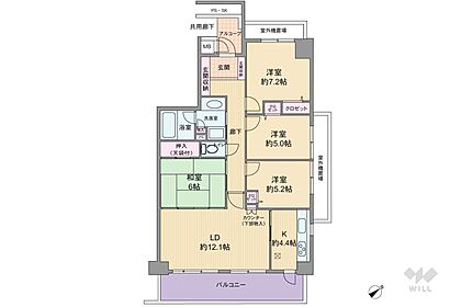 87.7平米の4LDK。LDK約16.5帖、バルコニー面積は12.78平米。キッチンは生活感の見えにくい独立型で、前面に換気窓、横にバルコニーへと続く勝手口があり、ゴミの一時置場としても利用できます。