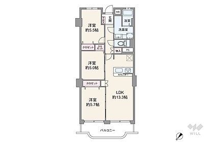 間取りは専有面積68.4平米の3LDK。LDK約13.3帖のプラン。バルコニー面積は9.13平米です。