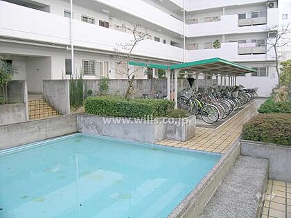 プールと駐輪場。阪急千里線「南千里」駅徒歩12分。1974年2月築。総戸数160戸の分譲マンションです。