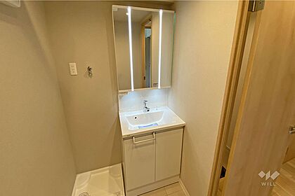 洗面室[2025年7月22日撮影]。阪急宝塚線「豊中」駅徒歩18分。1977年3月築。総戸数163戸の分譲マンションです。2025年7月リフォーム完成済み。