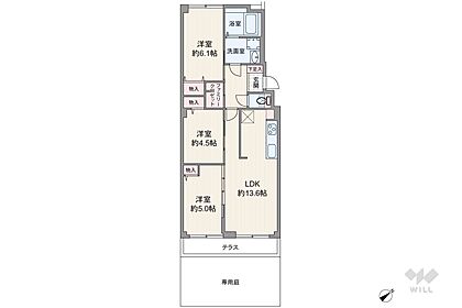 専有面積72.81平米の3LDK。南東向きにつき日当たり良好。専用庭付き。廊下には便利なファミリークローゼット付き。