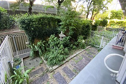 庭[2025年7月22日撮影]。阪急宝塚線「豊中」駅徒歩18分。1977年3月築。総戸数163戸の分譲マンションです。2025年7月リフォーム完成済み。