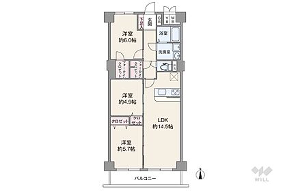 間取りは専有面積70.00平米の3LDK。LDK約14.5帖のプラン。バルコニー面積は6.72平米です。