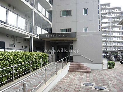 エントランス。阪急神戸線「園田」駅から徒歩約15分。総戸数242戸の大規模マンションです。