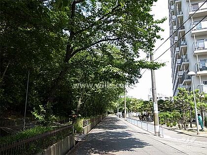敷地南側の前面道路。周辺は緑豊かな住宅地。阪急神戸線「園田」駅から徒歩約15分です。