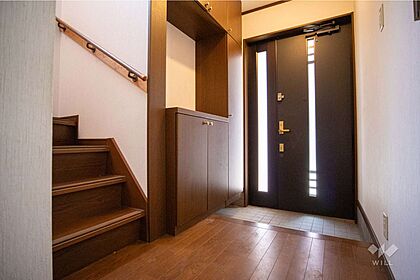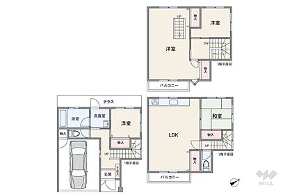 シャッター付き車庫の3階建て戸建。2沿線徒歩4分で駅近、学校・スーパー・公園も徒歩圏内です。