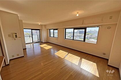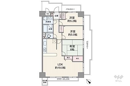 間取りは専有面積74.12平米の3LDK。LDK約19帖の横長リビングのプラン。複数方向に採光部があり、バルコニー面積は16.14平米です。