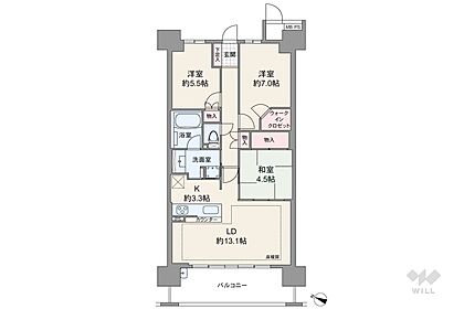 間取りは専有面積72.68平米の3LDK。バルコニー面積は12.16平米です。