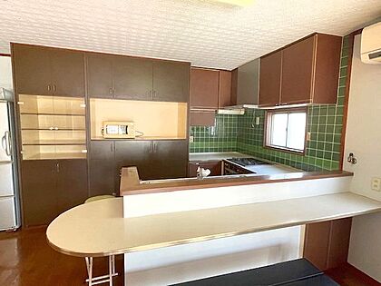 リビング(2025年10月)撮影カウンターキッチンからのショットです。木目のカップボードもあり収納スペースは充分です!