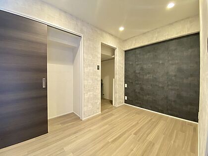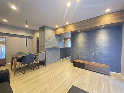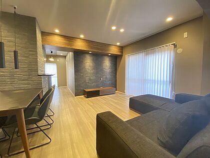 落ち着いたグレーのアクセントクロスと間接照明が調和した、スタイリッシュなリビング!