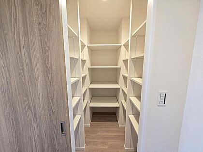 扇風機からクリスマスツリー、来客用の寝具。それぞれにサイズを合わせて使える可動式の棚が便利な納戸です。