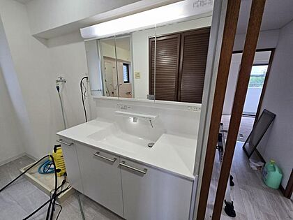 ワイドな洗面台は小物類も置けるので便利で使いやすいです!