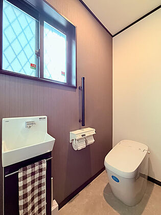 1階トイレはLIXILのオート開閉の節水型タンクレストイレ。また、暖房便座やウォシュレットなど快適機能も十分です。また、窓があり空気がこもらずいつもクリーンにお使いいただけます。