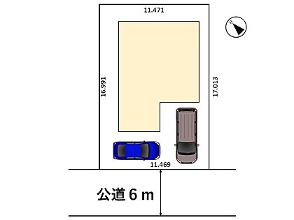 前面6m道路で間口も11mあり駐車もラクラスです。約59坪の広々敷地です。