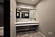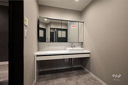 洗面室、三面裏収納のついた洗面所。化粧品やスタイリング剤・ドライヤー・ブラシなどの小物までが収納できます。[2025年8月2日撮影]