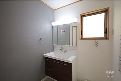 洗面室。三面裏収納のついた洗面所。化粧品やスタイリング剤・ドライヤー・ブラシなどの小物までが収納できます。[2025年8月24日撮影]