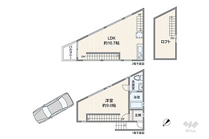 間取りは延床面積43.01平米の1LDK。2階リビングのプラン。