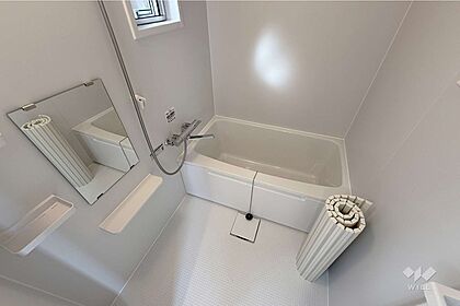 浴室。大きな窓がついているので換気がしやすく、カビが生えにくそうです。