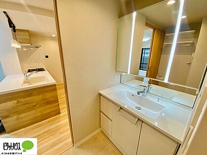 三面鏡の裏や、シンク下など多数収納を備えた、広々とした洗面化粧台です。