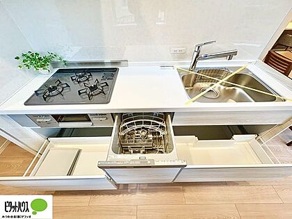 コンロは嬉しい3口。グリル機能付きで同時調理が可能なので、効率的にお料理が出来ます。凹凸の少ないデザインなので、お手入れも楽々。