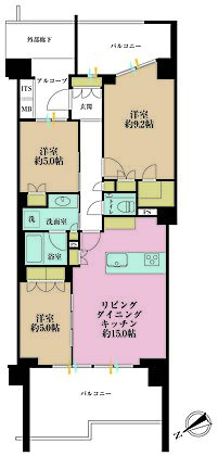 3LDK、専有面積77.78m2、バルコニー面積24.6m2