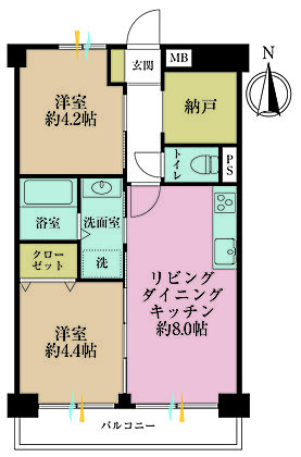 2LDK+S(納戸)、専有面積44.5m2、バルコニー面積5m2