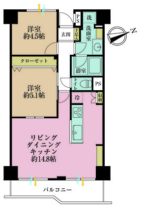 2LDK、専有面積55m2、バルコニー面積6.54m2
