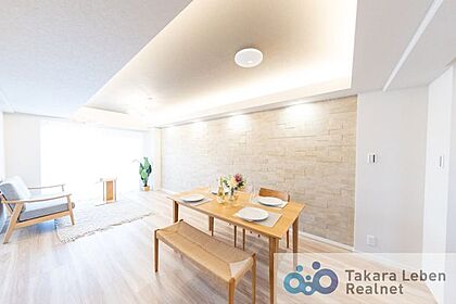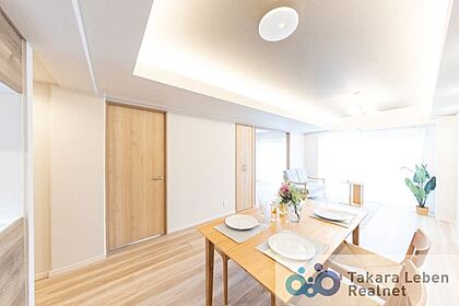 ナチュラルな木目調のフローリングや建具、関節照明が優しく照らし、居心地の良い空間を演出します。