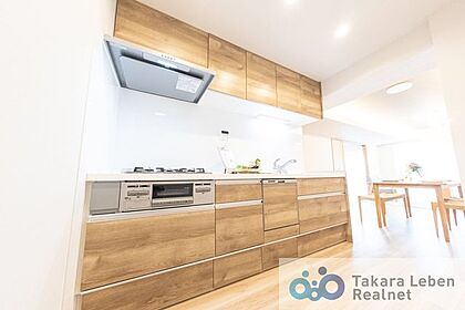 嬉しい3口コンロ。ビルトイン食器洗浄機の為場所を取らず忙しい朝も快適になります。また、収納はスライド式の為、奥にしまい込んだ調理器具等の取り出しもスムーズに行えるため、調理がはかどりますね