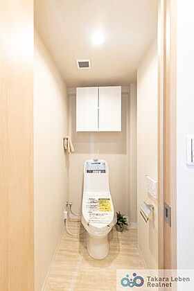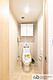ウォシュレット機能付きのトイレは壁掛けリモコンの上位グレードを採用。便座がスッキリした印象となり、限られた空間を広く見せる効果があります。