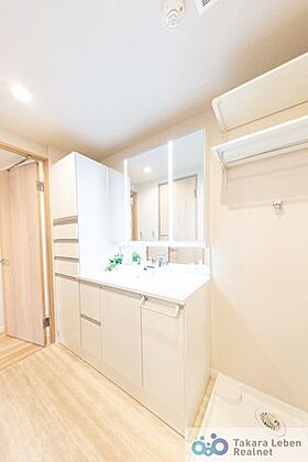 気持ちの良い朝はキレイな洗面所から。鏡裏の収納でモノが出がちな洗面所もスッキリ片付きます。
