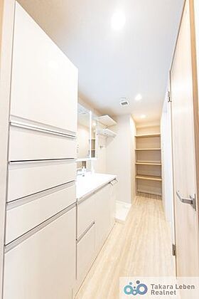 洗濯機置き場の上部には収納棚を設置。洗剤や掃除用具などもスッキリ収納できます。