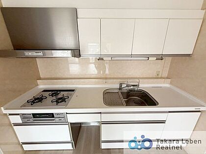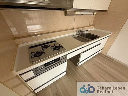 3口ガスコンロのシステムキッチン。ゴミ箱を置くスペースがございます。