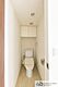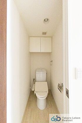 ウォシュレット機能付きのトイレは壁掛けリモコンの上位グレードを採用。便座がスッキリした印象となり、限られた空間を広く見せる効果があります。