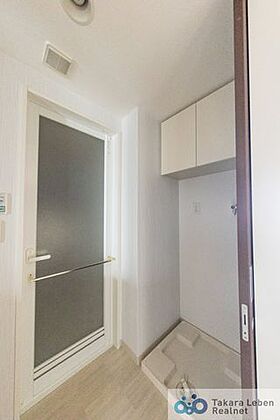 洗濯機置き場の上部には収納棚を設置。洗剤や掃除用具などもスッキリ収納できます。