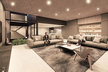 洗練されたデザインと光が織りなす空間。天井高3.2mの開放感に満ちたリビングで、中目黒4丁目の安らぎを満喫する邸宅。(内観パース)