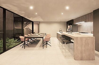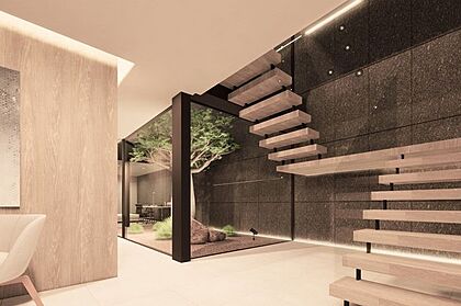 55畳のLDKへ誘う、光と緑のプロローグ。 中庭が視界を潤し、宙に浮くようなデザイン階段が空間を繋ぐ、洗練された生活の中心。(内観パース)