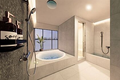 都会の喧騒を忘れるプライベート・スパ。 ホテルライクな空間には、円形浴槽とサウナを完備。心身を解放する、上質を極めた癒やしの時間がここに。(内観パース)