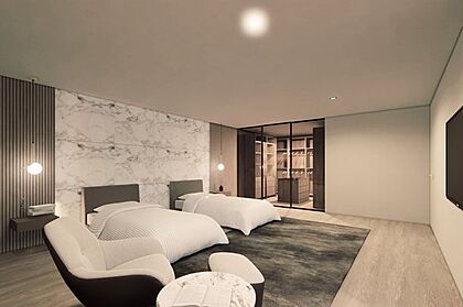 静寂の中で、上質な眠りを。 大理石調の壁面と照明が彩る主寝室。ウォークインクローゼットを併設した、心から寛げるプライベート空間。(内観パース)