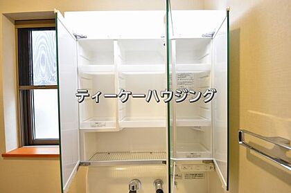 三面鏡の裏には収納がたっぷり。洗面室をすっきりきれいに使えます。
