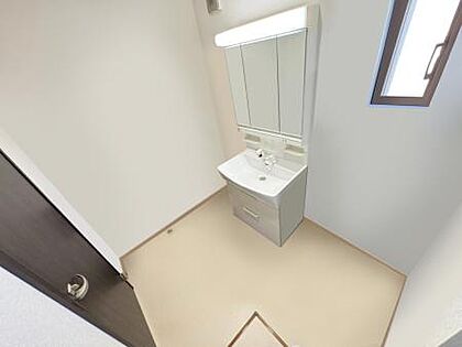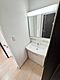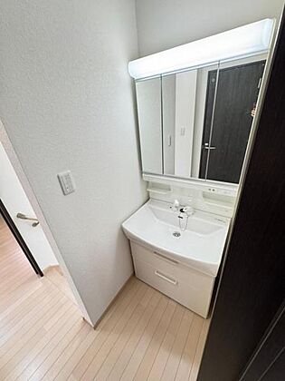 三面鏡が付いた洗面台は収納たっぷりで身支度も楽しくなります。