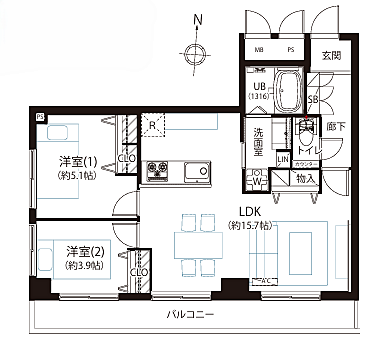 間取り 2LDK 専有面積 55.86m2