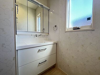 ゆとりの洗面スペースで朝の身支度も快適スムーズに!鏡の裏にも収納が確保されています!