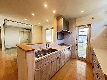 キッチン背面には備え付けのキッチンボード!収納力がありスッキリと片付いたキッチンです!